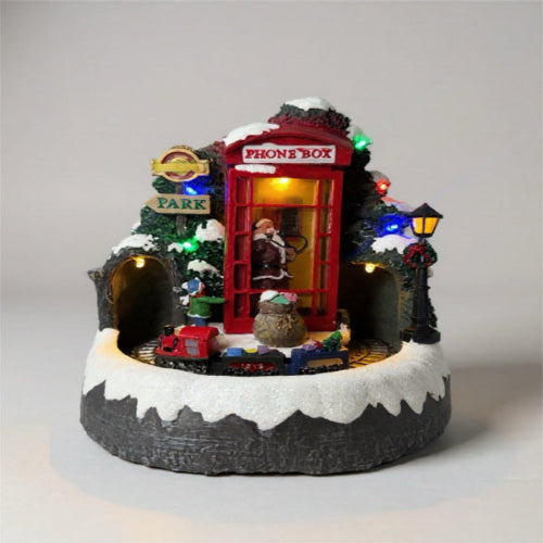 Adorno navideño de caseta telefonica con tren que gira. Cuenta con luces y sonido navideño. Utiliza 3 baterÃas AA. Dimensiones 18.7x18.3x22.2cm.