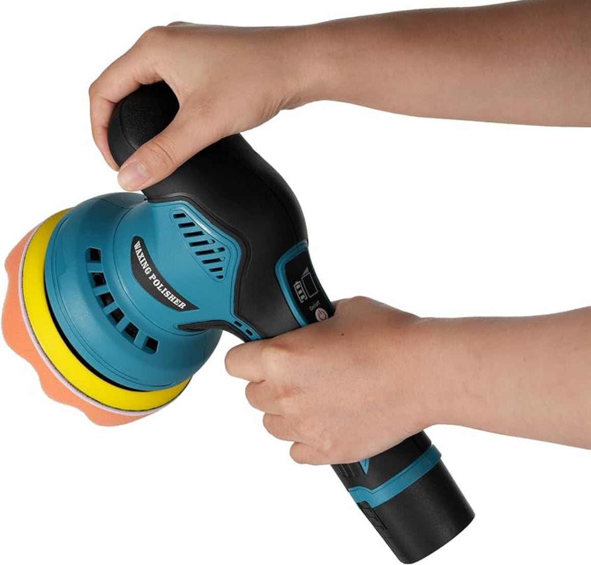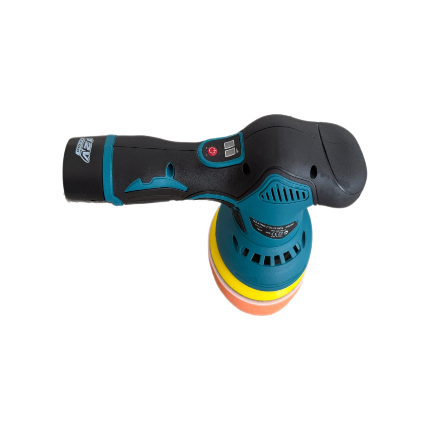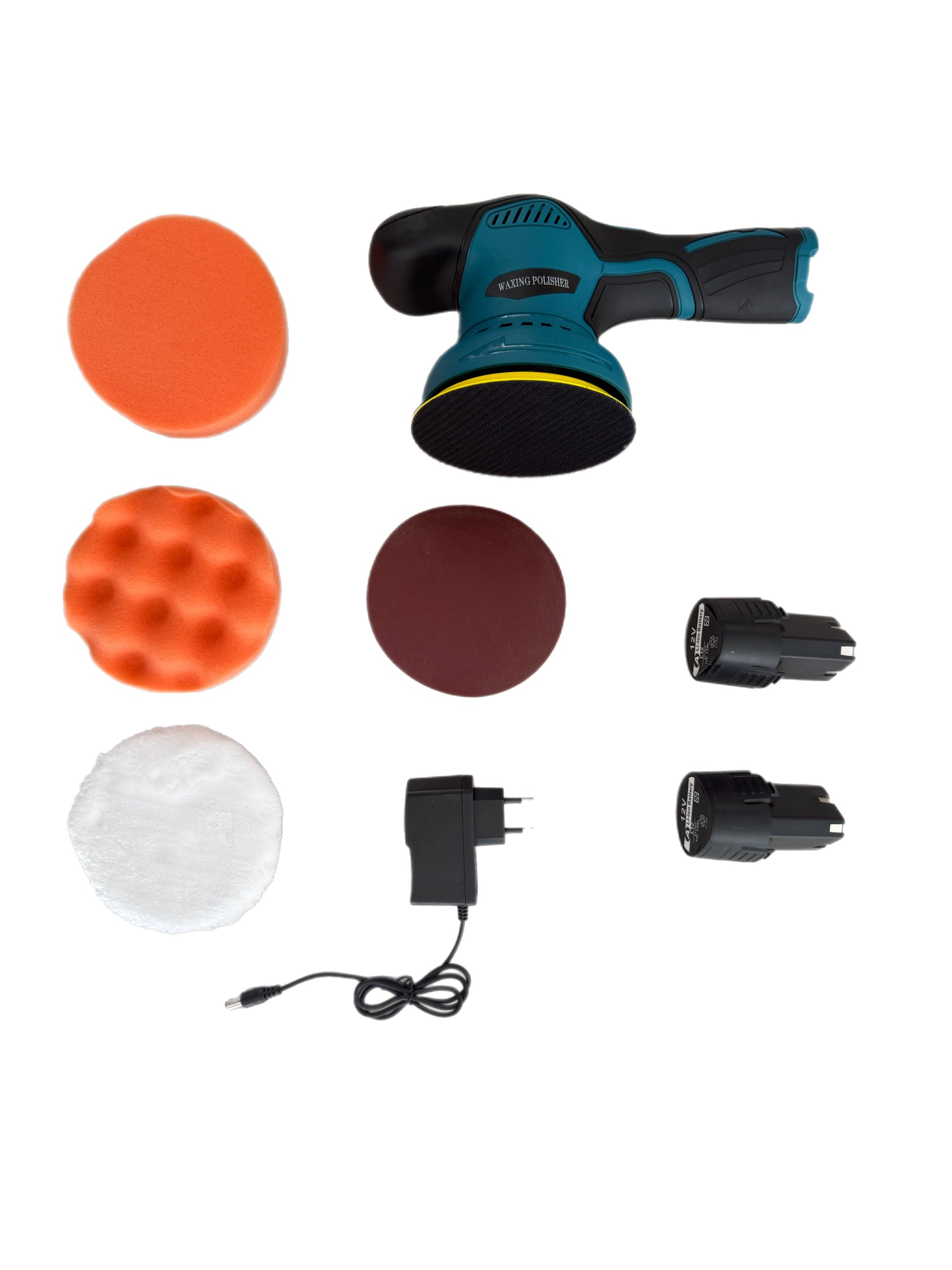 Pulidora portatil. Cuenta con dos baterÃas recargables y distintos accesorios para pulir y detallar.