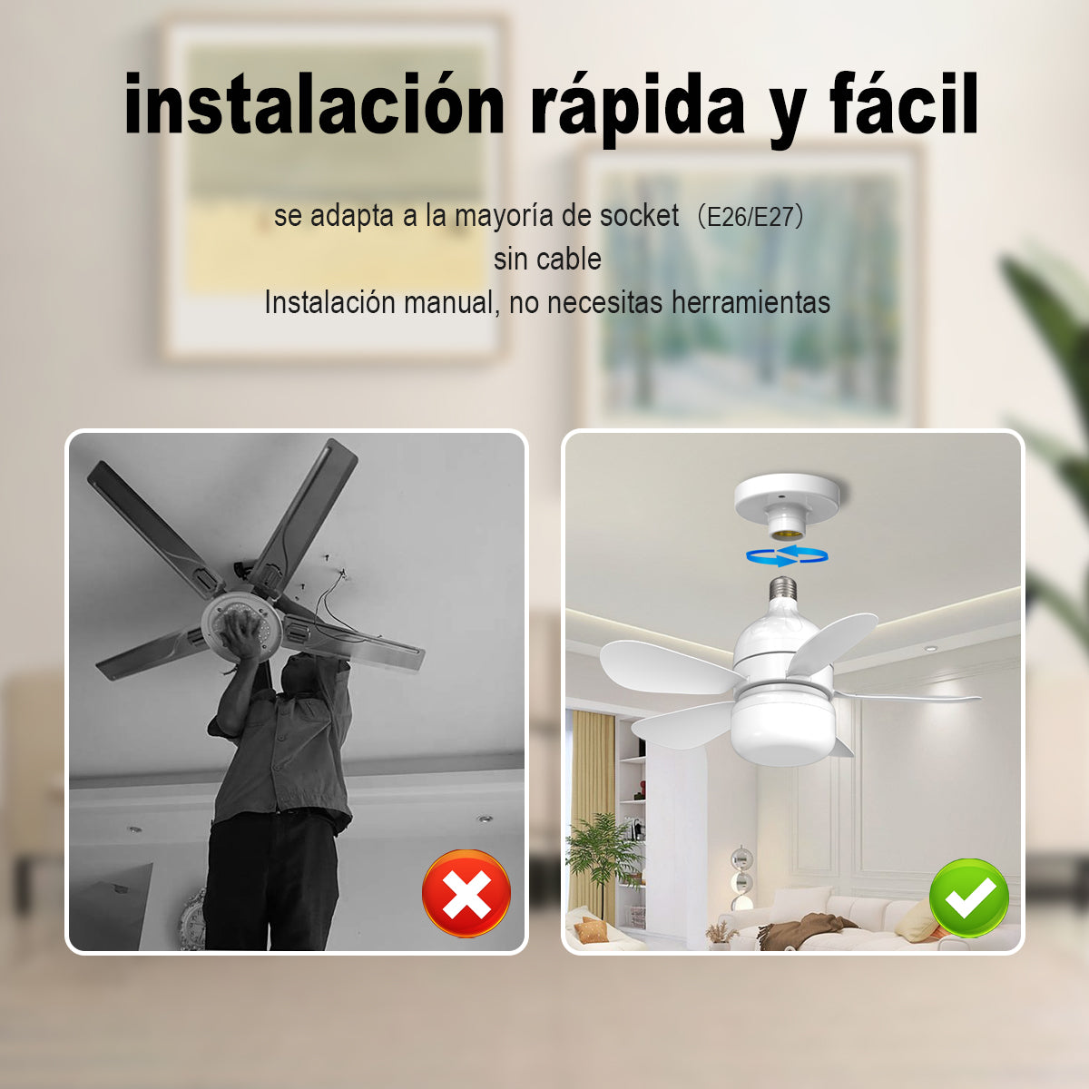 Bombillo LED y ventilador con control remoto que controla velocidad del ventilador y color e intensidad de la luz.